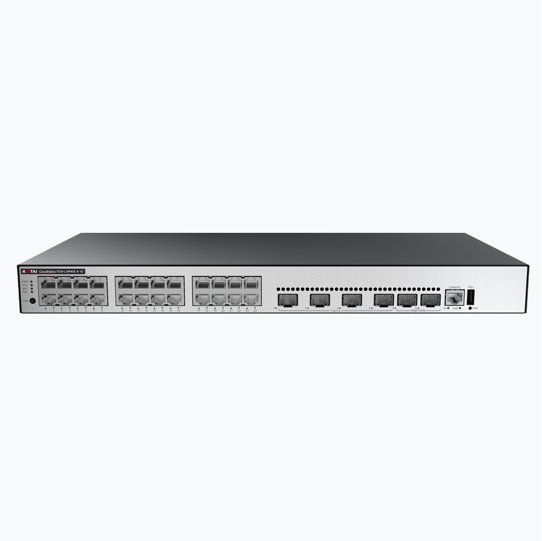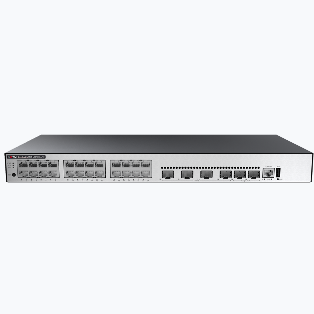 CM5535-L24T4XE-A-V2:24个千兆以太网电端口,4个 10GE SFP+端口,2 个 12GE堆叠口,固化单交流供电;